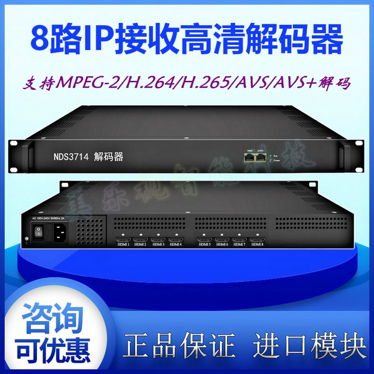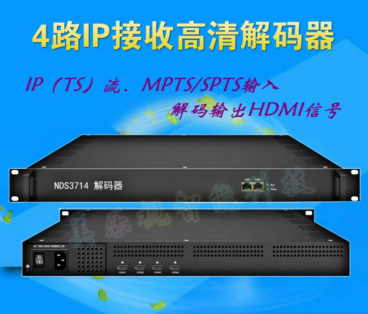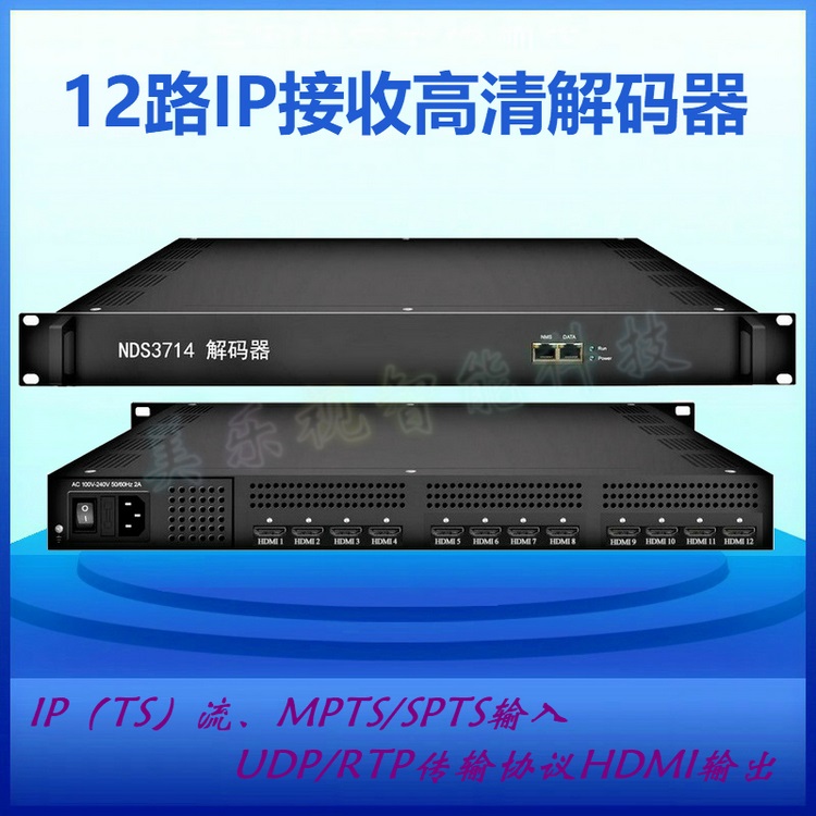 NDS3714 解碼器是我公司研發(fā)的一款專用于IP接收的高清解碼器。該設備采用標準1U機架式設計,可支持MPEG-2/H.264/H.265/AVS/AVS+解碼。設備主要功能是將MPEG-2/H.264/H.265/AVS/AVS+格式的IP(TS)流解碼輸出,最大支持4路/8路/12路IP(TS)流接收并解碼輸出4路/8路/12路HDMI信號。