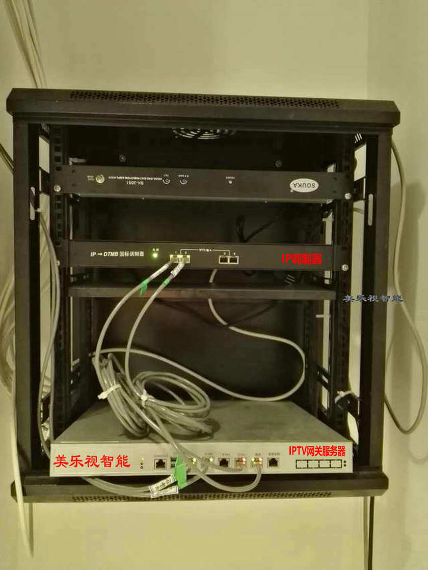 本公司為麗楓酒店時代城店承接,設(shè)計,施工,安裝一站式服務(wù),前端電視機房設(shè)計為IPTV電視直播解決方案,只用了寬帶運營商2個IPTV光貓共采集46套標清IPTV電視節(jié)目,接入IP-DTMB國標數(shù)字調(diào)制器走閉路有線電視線路傳輸?shù)?0個房間,整個電視前端機房核心設(shè)備只需要三臺就可以完成,不占用機房空間,安裝方便簡捷。安裝示意圖如下: