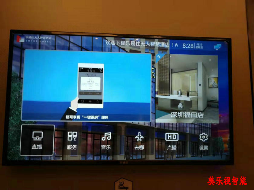 本公司于2018年5月8日承接樂易住無人智慧酒店的IPTV網(wǎng)互動電視前端工程方案設計,施工安裝一條龍服務,按酒店要求IPTV電視機房必須簡潔,經(jīng)濟,小型化IPTV網(wǎng)絡互動電視工程,給酒店節(jié)省大量空間和成本,并符合網(wǎng)絡傳輸?shù)椒块g的要求,美樂視公司按酒店方指標量身訂做,提供了1臺智慧酒店系統(tǒng)服務器,由工程師免費提供遠程調試安裝。2018本公司和深圳樂易住無人智慧酒店管理公司達成全面戰(zhàn)略合作,先后有四家無人智慧酒店在深圳開業(yè),全部有本公司鈾IPTV電視工程設備和技術支持。