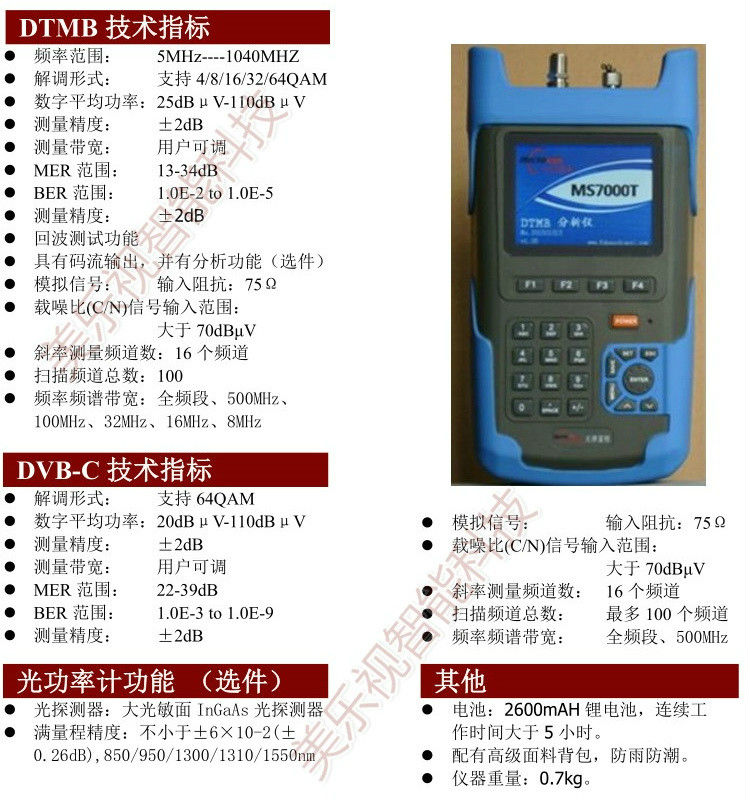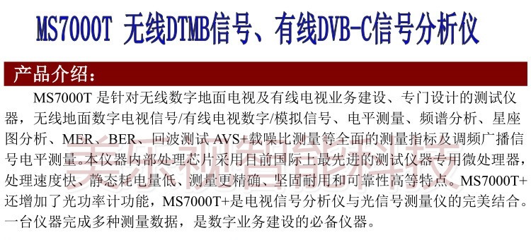 MS7000T是針對無線數(shù)字地面電視及有線電視業(yè)務(wù)建設(shè)、專門設(shè)計的測試儀器,無線地面數(shù)字電視信號/有線電視數(shù)字/模擬信號、電平測量、頻譜分析、星座圖分析、MER、BER、回波測試AVS+載噪比測量等全面的測量指標(biāo)及調(diào)頻廣播信號電平測量。MS7000T+還增加了光功率計功能,MS7000T+是電視信號分析儀與光信號測量儀的完美結(jié)合。一臺儀器完成多種測量數(shù)據(jù),是數(shù)字業(yè)務(wù)建設(shè)的必備儀器。