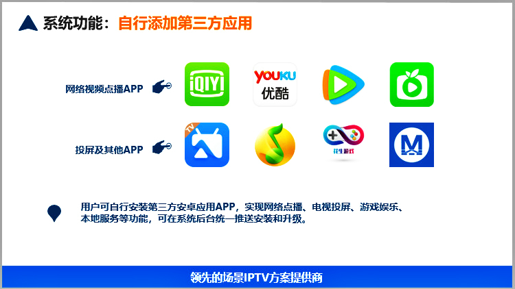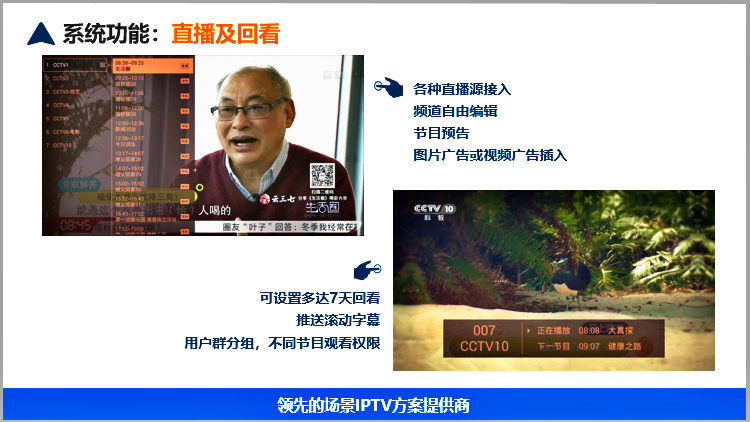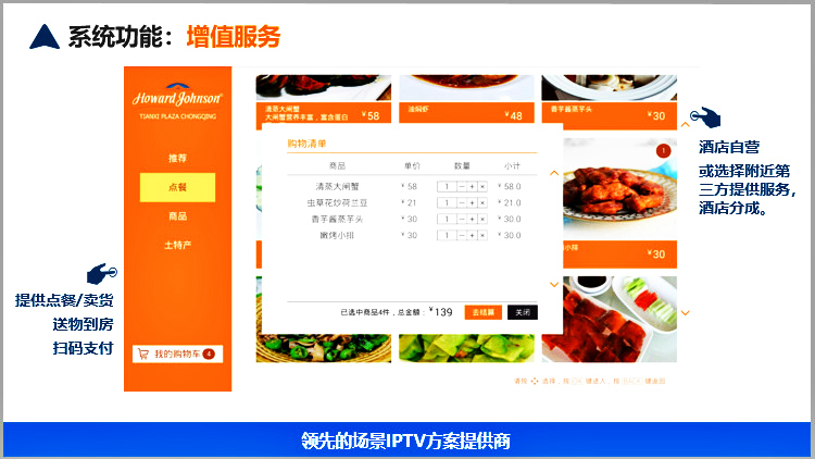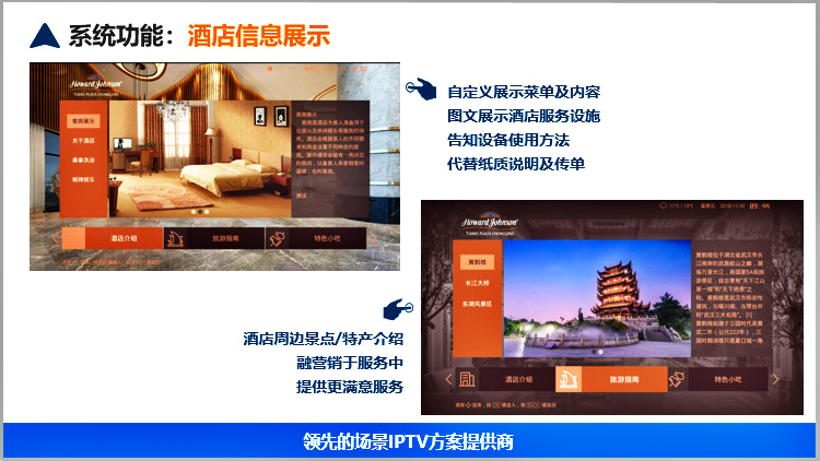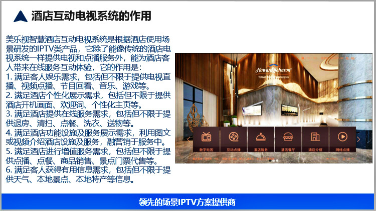美樂視智慧酒店IPTV互動電視系統(tǒng)服務(wù)器具有電信網(wǎng)關(guān)功能、可匯聚多方資源的直播、點播、酒店服務(wù)酒店增值等為一體的服務(wù)器,滿足搭建智慧酒店的IPTV互動電視基本要求.可以實現(xiàn)酒店歡迎頁、酒店LOGO展示、電視直播、高清點播、酒店風(fēng)采營銷廣告(視頻區(qū)和圖文區(qū))、滾動字幕、自辦頻道、自辦圖文頻道自辦視頻頻道、開機鎖定頻道、微信二維碼推送公眾號、WIFI密碼展示或掃描獲取、頻道排序、其他增值服務(wù)等。