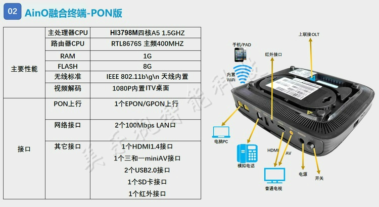 AinO融合終端(貓盒一體機(jī))系列產(chǎn)品是面向酒店用戶、小型商業(yè)用戶或是家庭用戶的智能終端設(shè)備。此終端內(nèi)置ITV業(yè)務(wù)、互聯(lián)網(wǎng)視頻業(yè)務(wù)并可通過內(nèi)置網(wǎng)關(guān)模塊與外部互聯(lián)網(wǎng)通信實(shí)現(xiàn)上網(wǎng)功能,并且支持WiFi功能。