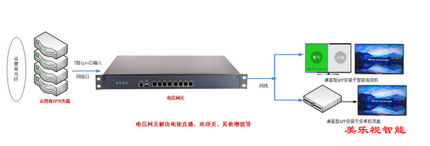 電信網(wǎng)關(guān)可采集運(yùn)營商IPTV直播信號(hào),匯聚直播信號(hào)后統(tǒng)一輸出到酒店局域網(wǎng)內(nèi),配合酒店的智能電視機(jī)安裝終端APP軟件,解決電視直播問題及其他增值問題。