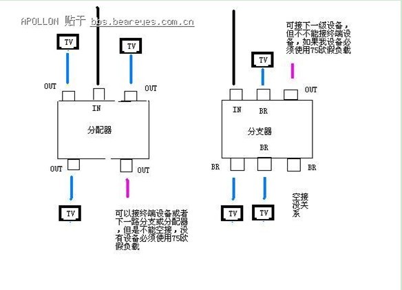 另外在使用時(shí)分配器輸出口必須阻抗匹配(不能懸空也不能短路)否則會(huì)產(chǎn)生反射,干擾其他用戶;分支器的主路輸出也必須阻抗匹配,但是分支口可以開路或短路。