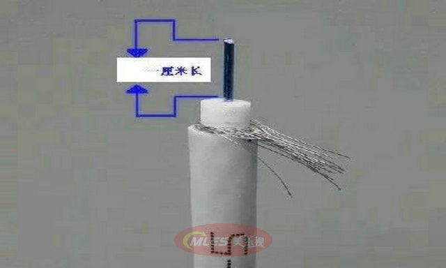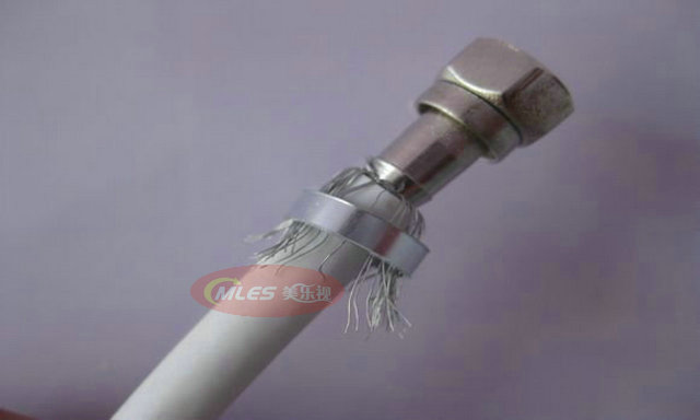 先把有線電視同軸電纜剝皮加工成這樣,注意切除線材的物理發(fā)泡層時(shí),要在高于切開(kāi)外皮平面的1.5~2 mm處切下,這樣就不會(huì)因?yàn)闅夂蜃兓斐晌锢戆l(fā)泡和銅芯萎縮。