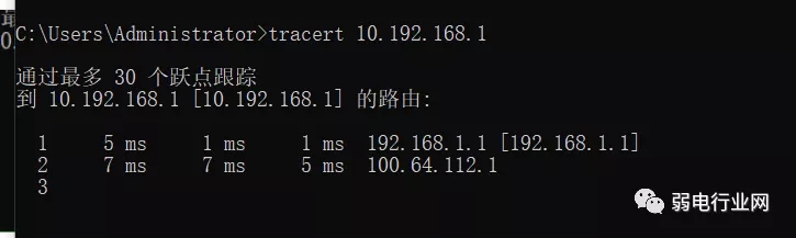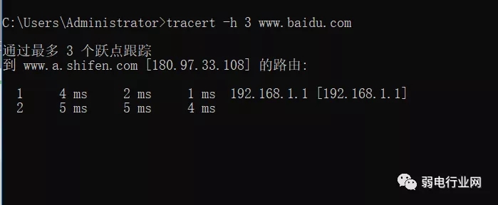 例4、“tracert -h 3 baidu.com”代表本次tracert搜索的最大跳數(shù),輸入3表示搜索在路由器跳轉(zhuǎn)3次,如下圖所示: