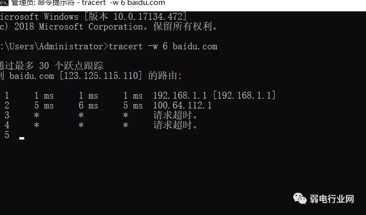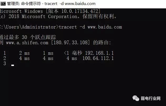 例3、“tracert -d baidu.com”代表不將IP地址解析到主機名稱,如下圖所示: