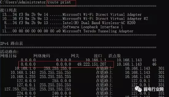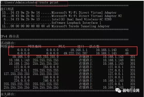 使用route print命令看一個0.0.0.0的網(wǎng)絡(luò)目標分別映射你的外內(nèi)網(wǎng)的網(wǎng)關(guān)。