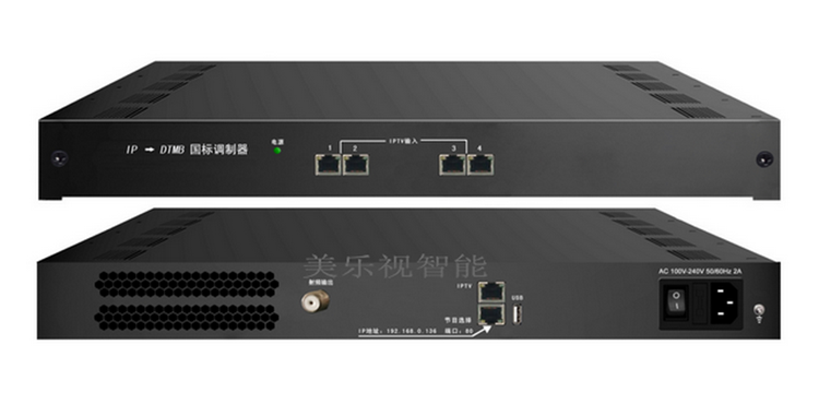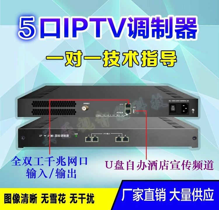 5網(wǎng)口IP轉(zhuǎn)DTMB調(diào)制器是我公司專為酒店、賓館、學(xué)校、醫(yī)院等場所解決數(shù)字電視信號源而最新研發(fā)的具備高性能、高性價(jià)比的便攜式IP轉(zhuǎn)DTMB智能國標(biāo)數(shù)字調(diào)制器。該設(shè)備前面板由4個(gè)百兆網(wǎng)口組成,4個(gè)網(wǎng)口均為IPTV輸入;后面板由1個(gè)射頻口、2個(gè)IP口和1個(gè)USB口組成,射頻口支持3/4個(gè)DTMB單載波輸出,USB口可以插上U盤播放酒店自辦宣傳節(jié)目,2個(gè)網(wǎng)口分別為1路全雙工千兆口IPTV輸入/輸出和網(wǎng)管口。該設(shè)備具有高性能、低成本的特點(diǎn),非常適合各種營業(yè)性場所(如:酒店、會所、茶樓、學(xué)校等)創(chuàng)建自辦宣傳節(jié)目和數(shù)字電視前端系統(tǒng)使用。